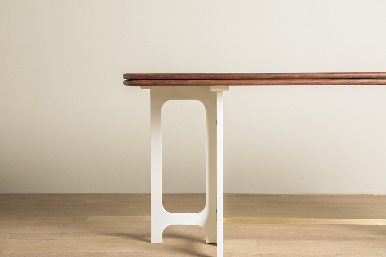 Balanced and adaptable, the Folding Console features a walnut top with a hinged base and arched legs that pivot to form a spacious dining table.
