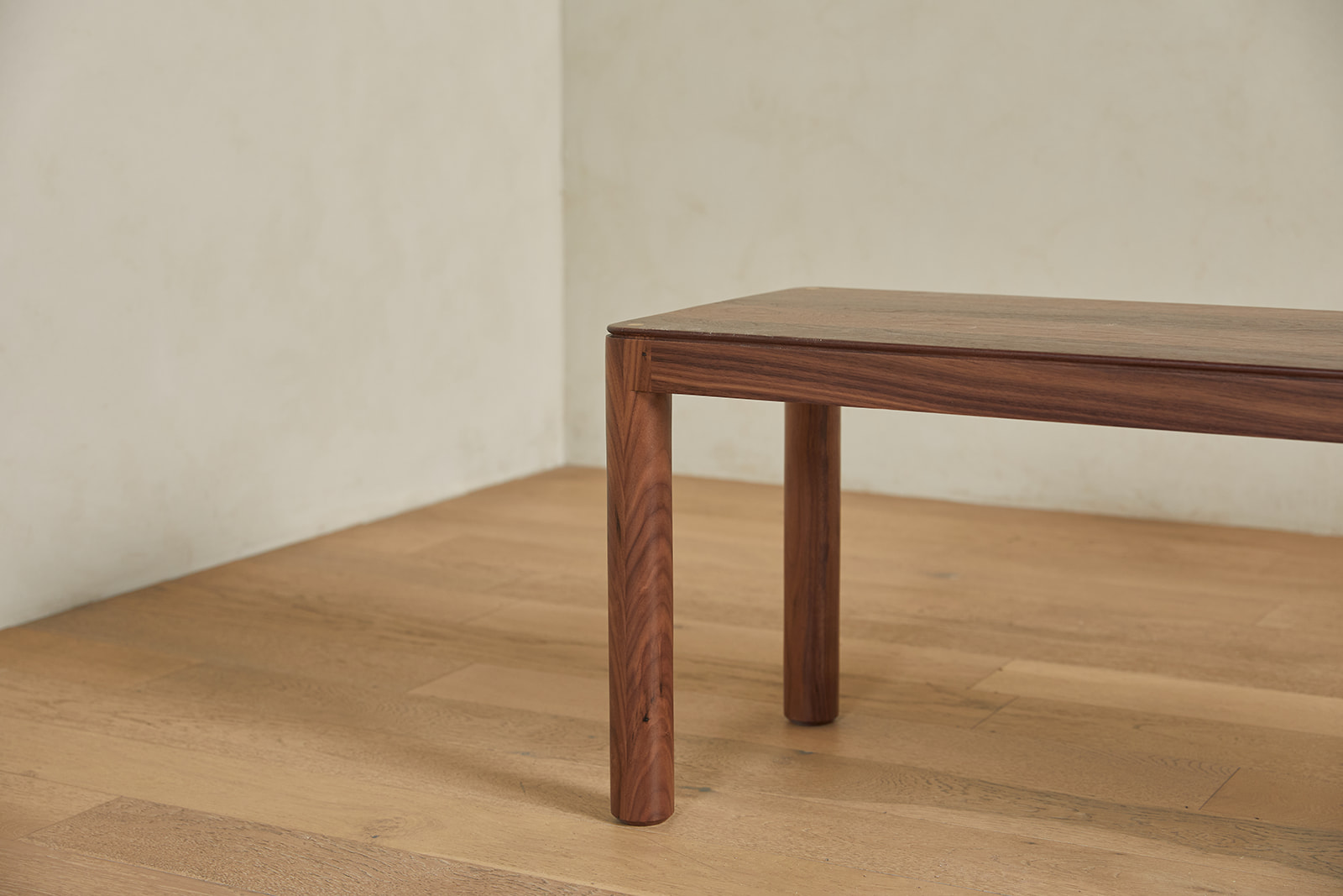 A classically minimal, sleek design with subtly crafted details, the Primary Bench features a vibrant walnut grain, circular legs, and inset brass at the rounded corners.